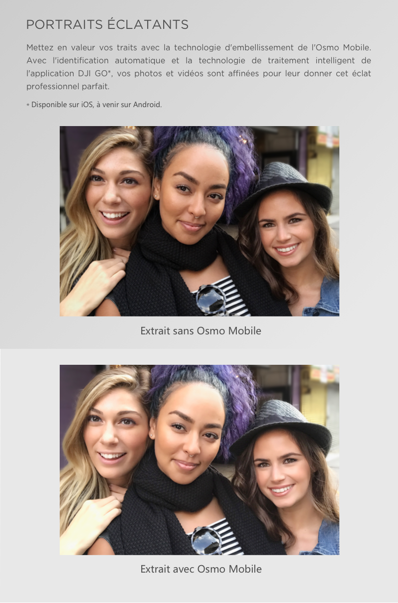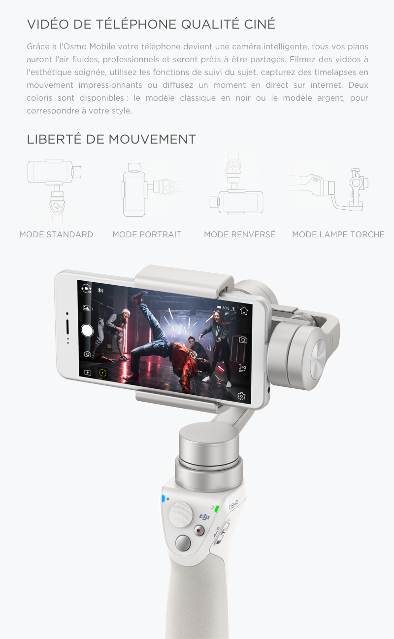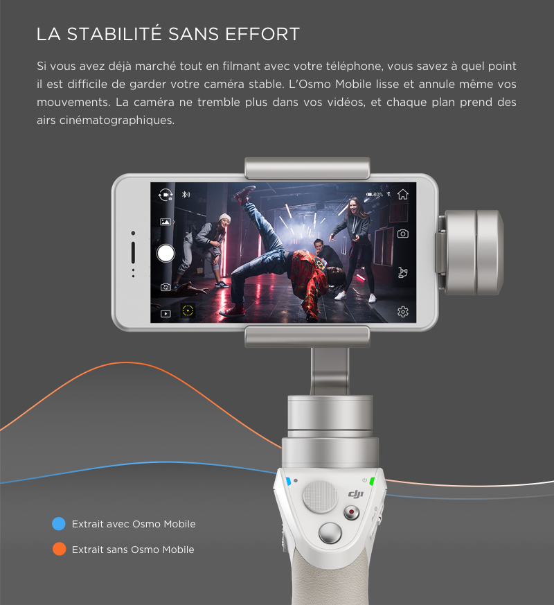 - Le système de stabilisation 3-axes de l'Osmo Mobile adoucit vos mouvements et rend chaque plan similaire à celui d'un film.