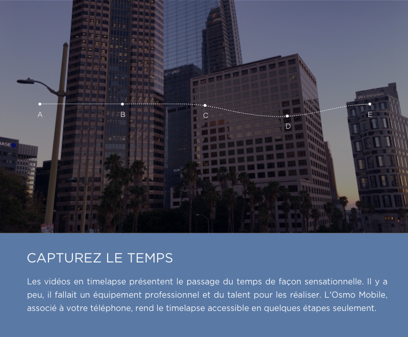 - Seuls quelques appuis sur l'écran suffisent pour lancer la fonction Timelapse en mouvement de l'Osmo Mobile, qui filme des vidéos montrant le passage du temps.