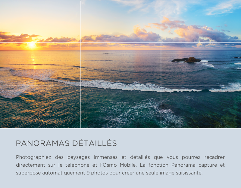 - La fonction Panorama de l'Osmo Mobile capture et superpose automatiquement 9 photos pour créer une seule image saisissante.