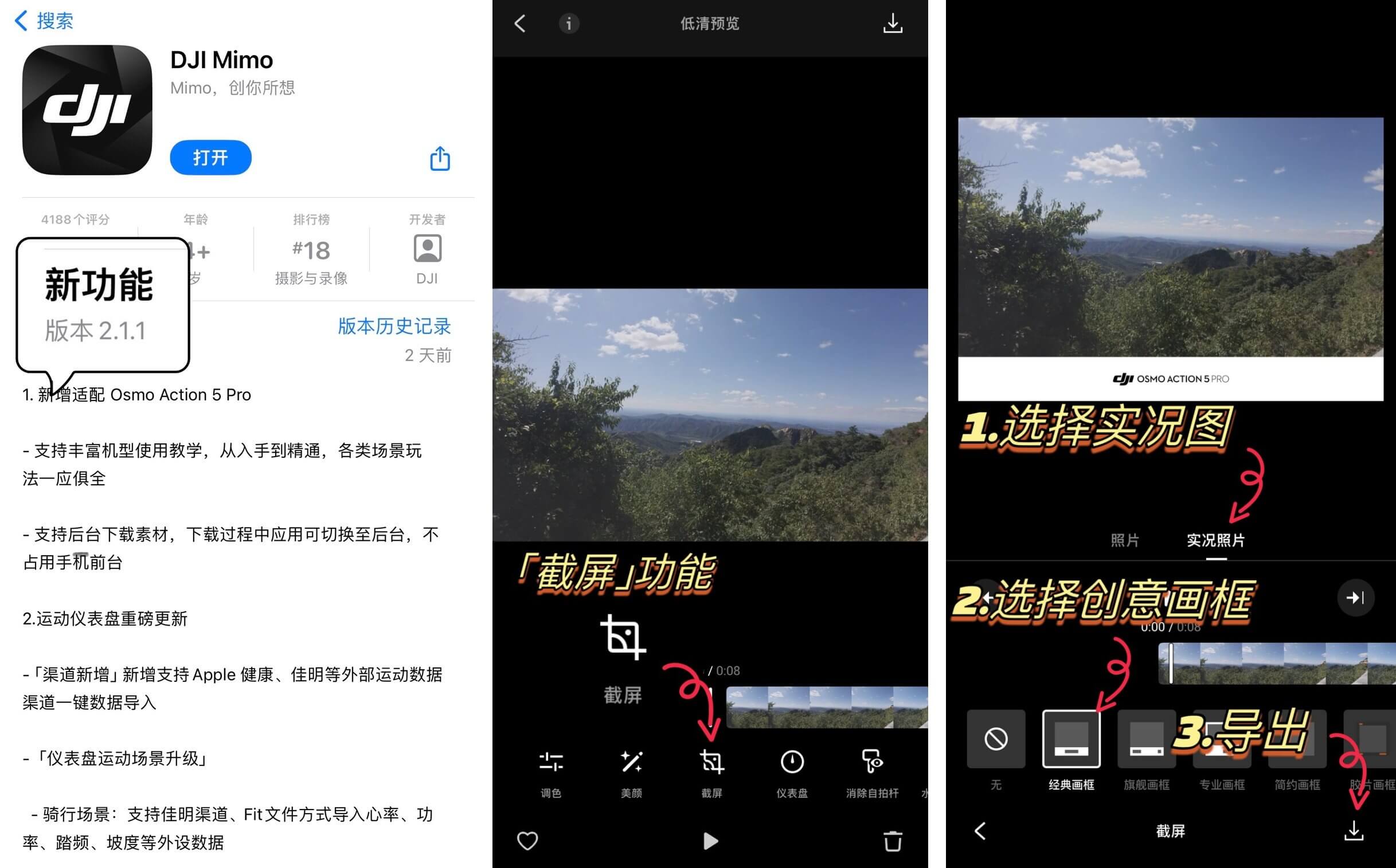 第一步:将 DJI MIMO 版本更新到2.1.0及以上版本,连接相机*,并选择所需视频第二步:点击“截屏”功能,即可选择实况照片第三步:选择添加“创意画框”第四步:点击右下角“导出”按钮,即可得到专属于你的实况照片