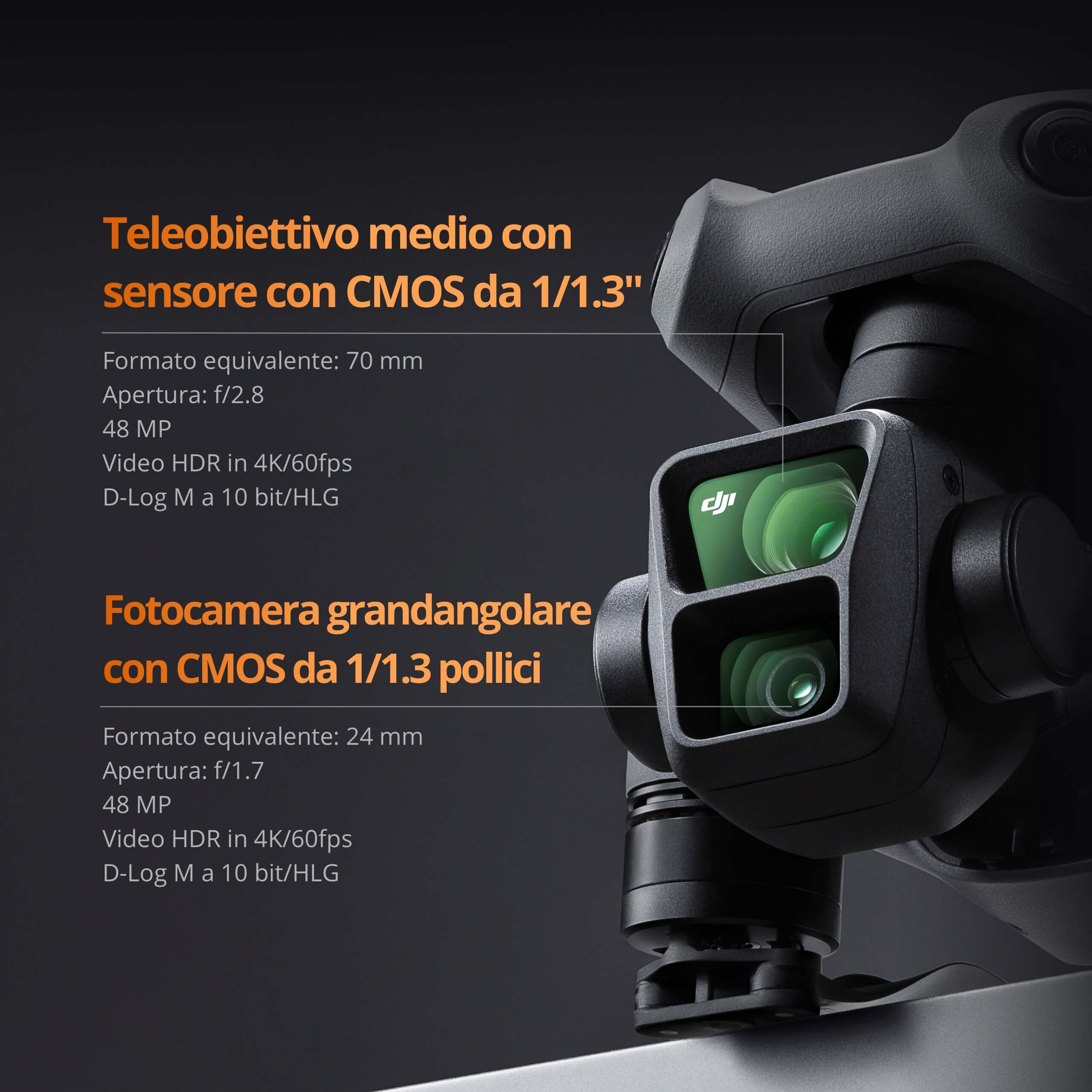 Il nuovo DJI Air 3 vanta il primo sistema a doppia fotocamera della serie Air, che integra una fotocamera grandangolare con CMOS da 1/1.3” e un teleobiettivo 3x con CMOS da 1/1.3” in un corpo elegante e compatto. Sperimenta delle immagini ultra dinamiche con una qualità costante.