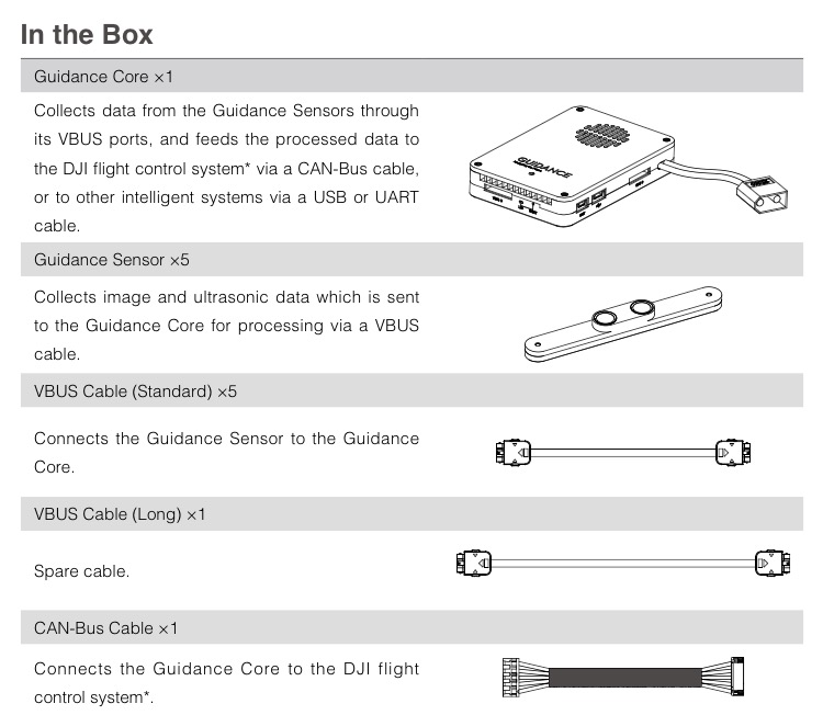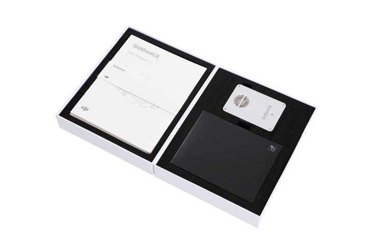 Guidance is a revolutionary visual sensing system. With a powerful processing core, integrated visual cameras, ultrasonic sensors, and the most advanced computer vision algorithms in the world, Guidance protects your platform and gives you a new level of safety and confidence in flight. Guidance includes five sensor modules and one central processor.